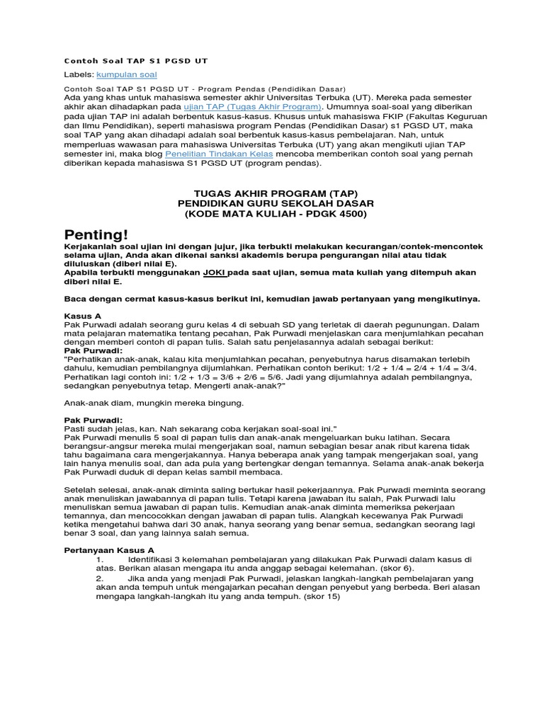 38 katalog kurikulum fkip program pgsd dan pgpaud universitas terbuka 2020/2021. Contoh soal tap s1 pgsd ut dan kunci jawabancontoh soal tap beserta jawabannyacontoh soal tap s1 contoh soal tap ut pgpaud tugas akhir program nah berikut ini kami bagikan untuk anda teman teman doc soal tap s1 pgsd ut imratul husnah academiaedu. Contoh soal tap s1 paud ut. Salah satu cara untuk mengukur kompetensi adalah dengan melakukan tes kompetensi guru tkpaud. Anda akan mendapatkan contoh soal soal ut jurusan pgpaud dari seluruh mata pelajaran seperti.