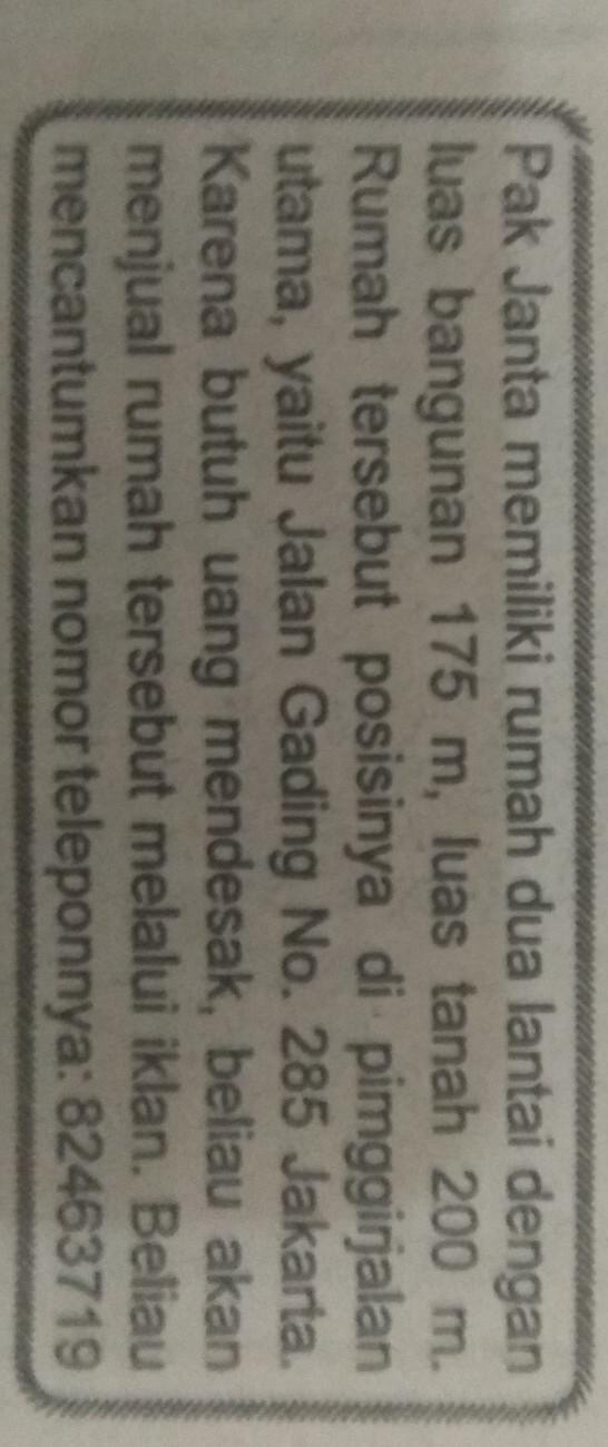 cara membuat iklan baris ada beberapa hal yang harus kita perhatikan dalam membuat iklan baris, di antaranya sebagai berikut. Acep js 17.38 bisnis online dan rumah. Meski saat ini marak perkembangan media sosial, namun iklan di koran masih banyak diminati. cara pasang dan contoh iklan di koran yang menarik. Contoh iklan baris jual tanah. Jln.permata indah 2b tanjung h.450jt,peminat harap menghubungi haikal ph.08571123456. Berikut ini terdapat beberapa cara menulis iklan baris terdiri atas. berdasarkan isi atau pesan yang disampaikan, iklan dapat dibagi menjadi: Sebab, iklan baris hanyalah memuat informasi seperlunya serta membutuhkan beberapa baris saja. Anda tidak perlu meniru persis seperti iklan yang mereka jual. iklan pada media ini, kadang dipecah lagi sesuai dengan bentuknya, yaitu iklan kolom maupun iklan baris. Metode ini adalah pengembangan dari promosi iklan yang menonjollkan daya tarik dengan gambar dan dengan informasi yang secara lengkap dan sangat detail dalam bentuk teks. Kebutuhan akan properti, khususnya rumah pribadi memang tak ada habisnya.
