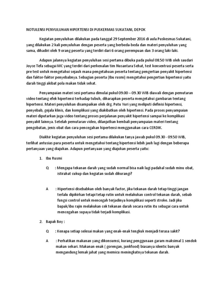 Laporan hasil kegiatan penyuluhan kesehatan. Ibu pkk yang menjadi peserta penyuluhan hipertensi oleh kader ini. Sementara prevalensi hipertensi dari hasil pengukuran sebesar 25,8%. Selamet simpang iv sipintelanai pura kota . Selesainya laporan pengabdian masyarakat ini tak .
