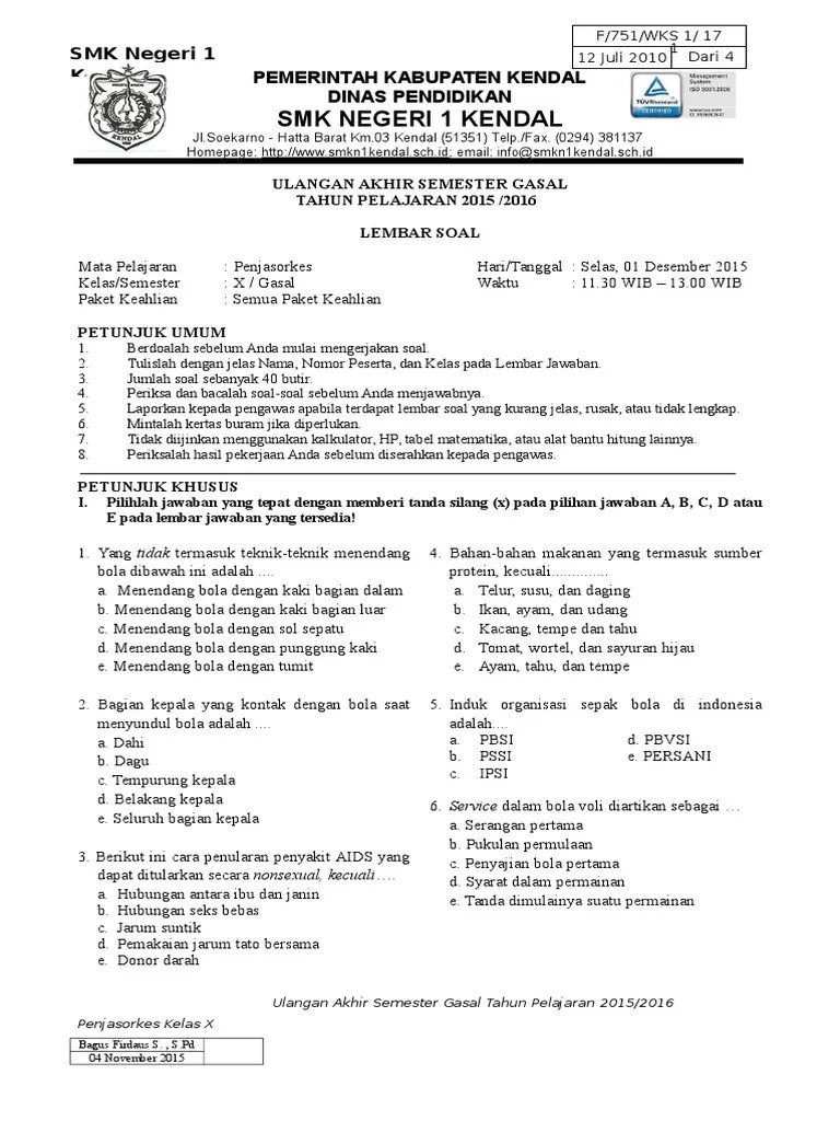 Jumlah pemain dalam pertandingan sepak bola adalah … a. Kunci jawaban soal untuk latihan penilaian akhir semester (pas) maupun ulangan akhir semester (uas) mata pelajaran pjok kelas 9 smp. Download soal uas pjok smp kelas 7 8 9 semester 1 k13 revisi 2018 soal penjaskes semester ganjil soal penjaskes smp dan kunci jawaban . Kelas 9, tentang penjas semester 1 dan 2. Kunci jawaban pjok kelas 9 :